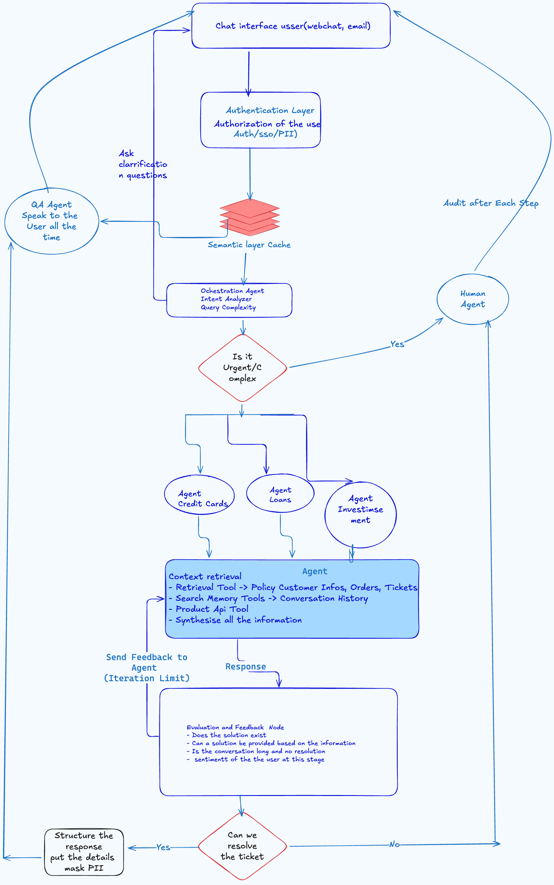 Logging and monitoring: After each component we will log the results in a NoSQl database. We will also track major escalation issues and those will help to improve the system with time. PII handling we will hide PII before any external LLM call, before saving the logs.