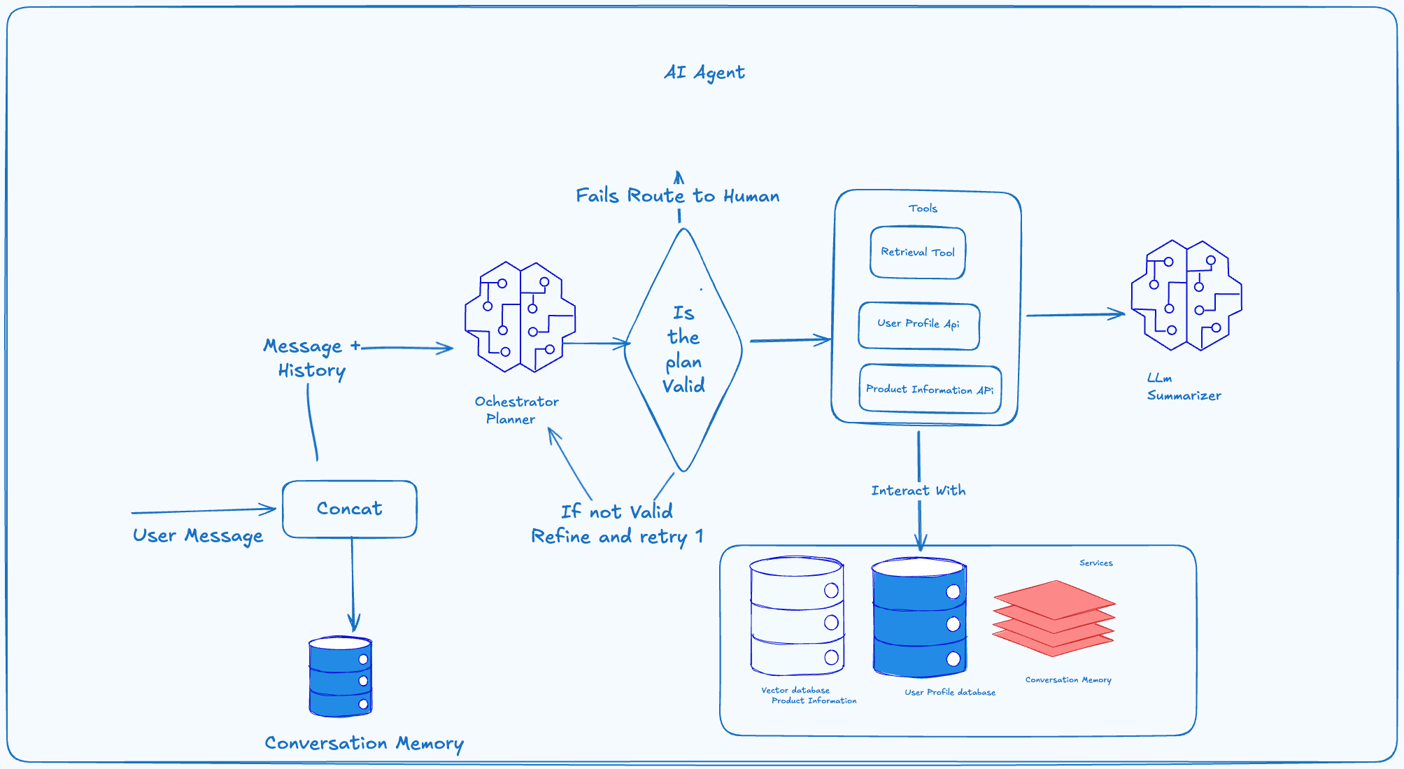 This will start first by checking the conversation history to build the context of the question, then ask the LLM to generate a plan to answer the question given the conversation history. After the plan is generated it will be validated, if it fails we can refine it 2 to 3 times and then if it fails we will return the question to the human agent.