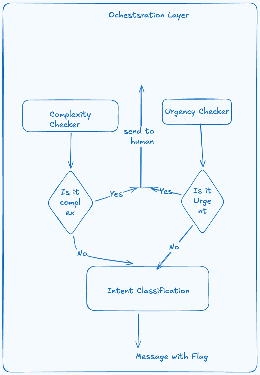 The first two checks will run in parallel: Complexity and Urgency. Complex and urgent queries should be routed to the agent.