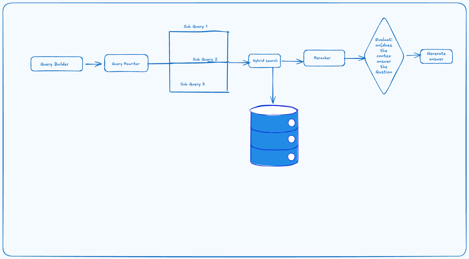 Query builder, we will use an LLM to decompose the user query in multiple subqueries and keywords to facilitate search. For each subqueries we will perform parallel search and keyword search using BM25. We will aggregate the results and use the text with a re-ranker. First evaluation check will be to check with the LLM if it can ask the question given the context. If we fails, we route the question to the agent with the information we have.
