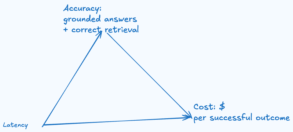 Accuracy + Latency → Cost goes up You add: rerankers, query rewriting, multi-stage retrieval, more evals, more calls.